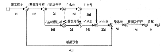【背景资料】 某公路跨河桥上部结构为长 13m 单跨简支预制板梁,下部结构由灌注桩基础、承台和台身构成。施工单位按合同工期编制了如下网络计划图,经监理工...