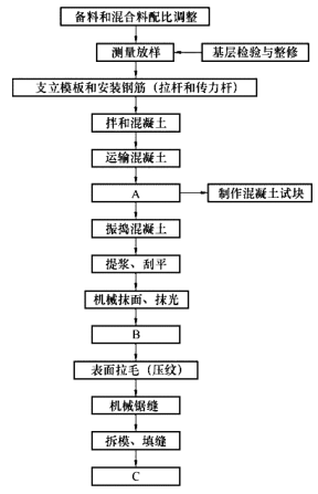 解析 1. 左线隧道为短隧道,因为左线隧道长=788-308=480m<500m 右线隧道为中隧道,因为右线隧道长=776-264=512m,1000m>512m>500m 2. 混凝土路面面层施工时不需要③、⑤、⑥。不正确,因为按相关法规要求,用人单位必须为本单位全部职工缴纳工伤保险。 3. A 为摊铺混凝土、B 为人工收面(或人工修整表面)、C 为养护。 4. 称为龟裂。 5. 还应制定的措施有:照明、防尘、防有害气体、防辐射。