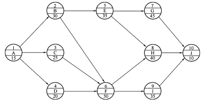 解析 1. 工期为 145 天。 关键线路为:①→②→③→④→⑤→⑦→⑧→⑨→⑩或 A→B→F→H→J。 2. 事件一中,工作 D 为非关键工作,总时差为 10,其对总工期的影响是延误 8-10=-2 天。 事件二中,工作 F 为关键工作,其对总工期的影响是延误 8 天(1 分)。 事件三中,工作 E 为非关键工作,总时差为 10,其对总工期的影响是延误 15-10=5 天。 故工作 D、E、F 延误对总工期的影响是使总工期延长 max{5,8}=8 天。 施工单位可以就事件一、三导致的工期延误提出工期补偿要求,不能就事件二导致的工期延误提出工期补偿要求。施工单位可获得的工期补偿为 max{-2,5}=5 天。 3. 事件一:属于天气原因,属双方共同承担的风险,不能提出费用索赔。 事件二:由于施工单位原因导致的损失不能提出费用索赔。 事件三:由于业主的原因导致的损失可以提出费用索赔。索赔金额为 15×1600=24000 元。 4. 单代号网络为: