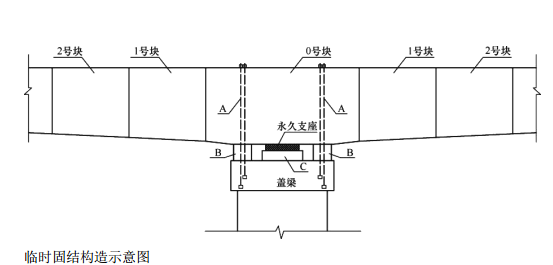 问题 背景资料:某施工单位承接了一座多跨变截面预应力混凝土连续箱梁桥,大桥分为上下游两幅,每幅单箱顶板宽 10.5m,底板宽 6m。大桥采用钻孔灌注桩基础,双柱式桥墩(墩柱高 15~26m不等),普通钢筋混凝土盖梁。 上部结构 0 号块采用墩顶混凝土现浇施工,临时固结构造示意图如下图所示。 其他梁段(1~19 号)采用预制场长线法台座预制,缆索吊装系统悬臂拼装。各梁段之间腹板采用剪力齿衔接,环氧树脂粘合,顶板与底板均设 20cm 湿接缝。施工中加强测量管理,各梁段施工按照设计标高安装定位,控制好全桥线形。 1~19 号梁段长线法预制及悬拼安装施工工序为:预制场及存梁区布置→梁段浇筑台座准备→梁段浇筑及养护→D→梁段外运→梁段吊拼就位→临时预应力张拉及腹板剪力齿粘合→E→预应力穿索与张拉、封锚→下一梁段施工。 按照交通运输部颁布的《公路桥梁和隧道工程施工安全风险评估指南(试行)》的要求,施工单位对全桥进行了总体风险评估,评估结果为Ⅲ级。 问题: 1. 写出图中 A、B、C 结构的名称。 2. 长线法预制及悬拼安装施工中工序 D、E 各是何种工序? 3. 各梁段悬拼安装线形控制测量的关键项目是哪几项? 4. 该大桥是否需要进行专项风险评估?说明理由。若需要进行专项风险评估,说明还需进行哪几个步骤?