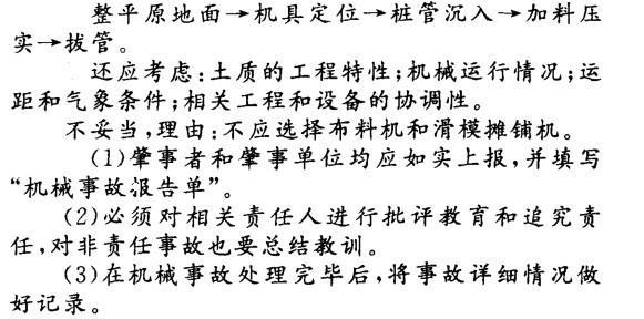 问题 本项目若采用抛石挤淤的方法处理软基,是否合理?说明理由。 根据背景材料所述,按施工的先后顺序列出砂井的施工工艺。 选择施工机械时,除了考虑作业内容外,还应考虑哪些因素?针对土石填筑施工,项目部所 选择的机械是否妥当?说明理由。 项目部还应做哪些工作来处理该背景中的机械设备事故?