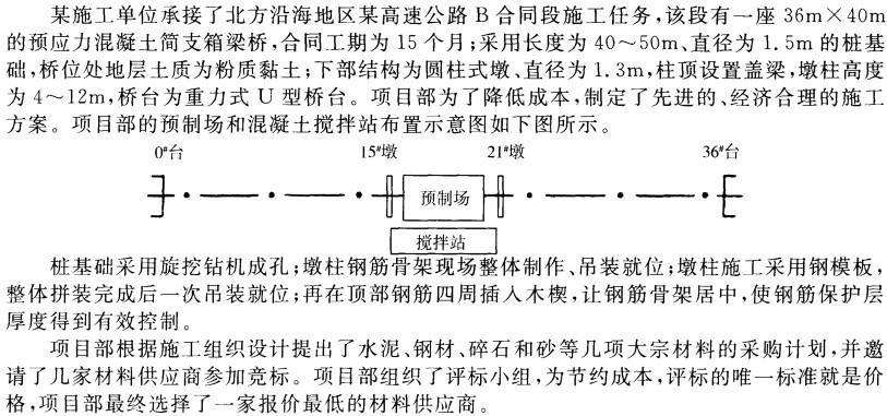 问题 说明背景材料中的预制场和搅拌站布置方式的优点。 背景材料中采用的墩柱钢筋保护层控制方法是否可行?说明理由。 如果主梁张拉后的预拱度超过了规范要求,将可能导致桥面系中产生什么病害?并提出防治这种病害的三条措施。 指出背景材料中合格材料供方选择上的缺陷。并说明合格材料供方评价的依据。