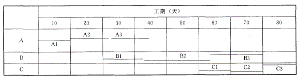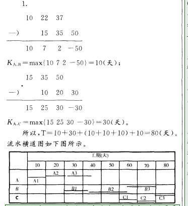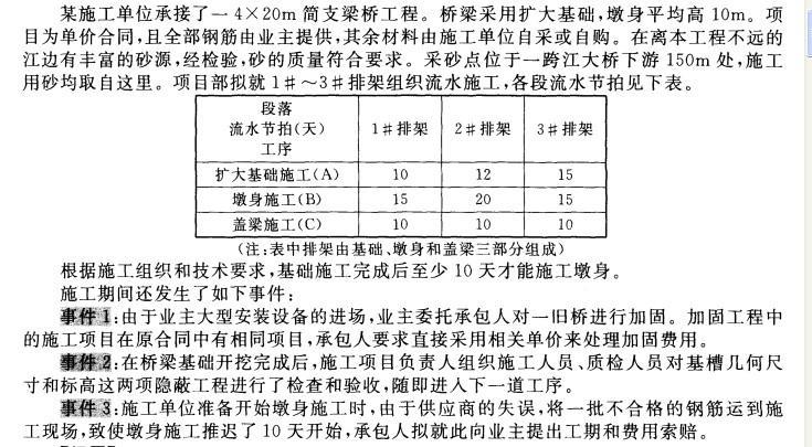 解析 1. KA,B=max {10,7,2,-50} =10(天);KA,C = max {15,25, 30,-30} =30(天)。 所以,7=10 + 30+ (10 + 10 + 10)+10 = 80(天) 流水横道图如下图所示: 2.不合理。因为按照索赔的一般要求,由于需要加强桥梁结构以承受“特殊超重荷载”而索赔,承包商只能索赔有关工程费用,无权得到利润。但单价合同中的单价包含了利润在内的一切费用。 3.不完善。检査项目还应有彳土质情况、地基处理,还应请监理单位、建设单位、设计单位相关人员参加。 4.可以。因为首先造成墩身施工推迟是由于业主的原因,而且该推迟会使工期延长,并会带来人员、设备的窝工,所以,承包商可以提出工期和费用索赔。 5.存在的违法行为是:在大中型公路桥梁周围200m(施工单位是在150m)范围内取砂,违反了《公路法》的规定。应由交通主管部门责令停止违法行为,并可以处3万元以下罚款。