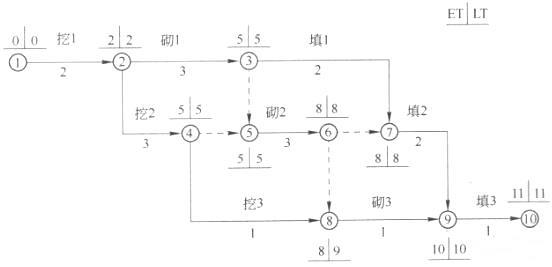 解析 教材P301 挖3工序的总时差=箭头点最迟-箭尾点最早-本工序持续=9-5-1=3。