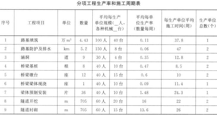 问题 某工程A标段的招标文件要求投标人在编制标前施工组织设计应填写“分项工程生产率和施工周期表”。 问题: 根据施工总体计划和分项工程生产率和施工周期表中已知数据完成未完成的部分。