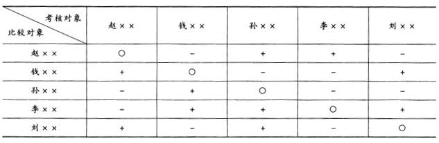 共用题干某企业的某职能管理部门正在运用如下的方法对其5名管理人员进行绩效考核,考核结果如下表所示,表中“0”表示两者绩效水平一致,“+”表示考核对象比比较...