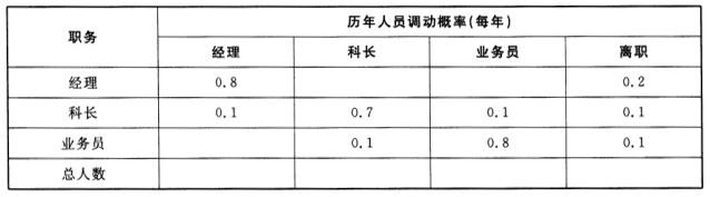 问题 共用题干某公司人力资源部采用下列方法对下一年的人力资源情况进行预测。该公司近几年的人员变动情况如下表所示。该公司期初人员数量分别为:经理10人,科长30人,业务员120人。