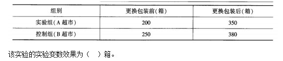 解析 有控制组的事前、事后对比实验是指在实验中分别设立控制组和实验组两个样本组,要求对实验组和控制组分别进行实验前测量和实验后测量,然后进行事前、事后对比。实验变数效果的计算公式为:实验变数效果=实验组变动结果-控制组变动结果=(x2-x1)-(y2-y1)。本题中,(350-200)-(380-250)=20(箱)。