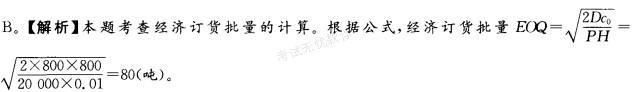 问题 某小型化工厂每年需消耗某种原材料800吨,每吨原材料的价格为20 000元,每吨原材料的保管费率为1%,单次订货成本为800元,则经济订货批量为( )吨。