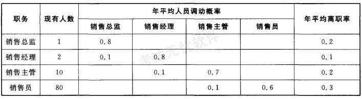 解析 马尔可夫模型法的思路是,找出企业过去在某两个职位或岗位之间的人事变动的规律,以此推测未来企业中这些职务或岗位的人员状况。根据马尔可夫模型法计算,该企业2013年销售主管内部供给量=10 × 0. 7 + 80 × 0. 1 = 15(人)。