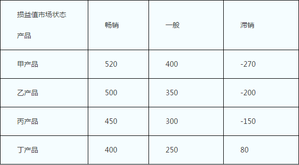 解析 本题考察第一章第四节企业经营决策的方法下定量决策方法知识点。甲产品的加权平均损益值是:520*0.75+(-270)*0.25=322.5乙产品的加权平均损益值是:500*0.75+(-200)*0.25=325丙产品的加权平均损益值是:450*0.75+(-150)*0.25=300丁产品的加权平均损益值是: 400*0.75+80*0.25=320乙产品的损益值最高,则最佳方案是乙产品