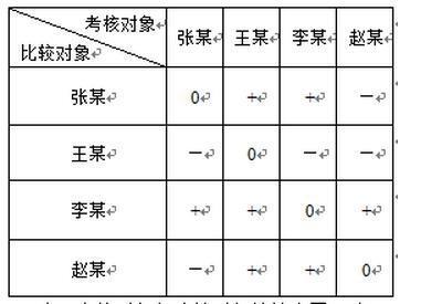 问题 某公司对4名经理进行考核,在听取个人述职报告后,由总经理、各部门员工以及其同事对其工作绩效进行评价。然后,公司又组织专家对4人的工作绩效进行了量化评价,评价结果如下表 0表示考核对象与比较对象绩效水平一致,+表示考核对象比比较对象绩效水平高,—的含义与+相反 该公司采用的绩效考核方法是( )。