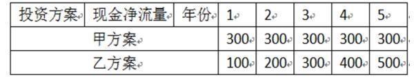 解析 乙方案初始投资是1000万,通过表格看,第1年收回100万,第2年收回200万,第3年收回300万,第4年收回400万,则前4年一共收回100+200+300+400=1000,即投资回收期为4年。