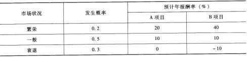问题 共用题干 某企业准备用自有资金2亿元投资一个项目,现在A、B两个项目可供选择。据预测,未来市场状况存在繁荣、一般、衰退三种可能性,概率分别为0.2、0.5和0.3,两项投资在不同市场状况的预计年报酬率如下表所示。为了做出正确决定,公司需进行风险评价。