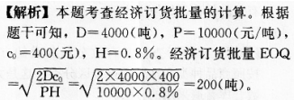 问题 假设企业某种原材料的年需求量为4000吨,单价为10000元/吨,单次订货费用为400元,每吨年保管费率为0.8N,则该种原材料的经济订货批量为( )吨。