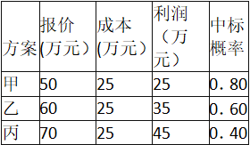 某企业参加投标,其可供选择的方案如下表所示。根据此表提供的各备选方案,企业的最佳报价为( )万元。 A.25 B.50 C.60 D.70