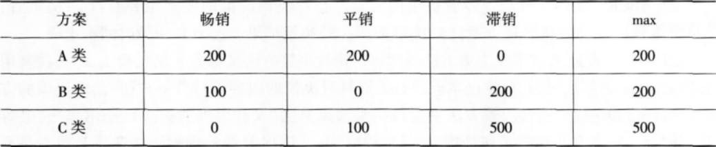 解析 此题考查后悔值原则的应用。利用后悔值原则进行方案选择的步骤为:(1)计算损益值的后悔值矩阵。用各状态下的最大损益值分别减去该状态下所有方案的损益值,从而得到对应的后悔值,见下表。 (2)从各方案中选取最大后悔值,如上表的max栏。 (3)在已选出的最大后悔值中选取最小值,对应的方案即为用最小后悔值选取的方案。min{200,200,500}=200,对应的方案为A类或B类。