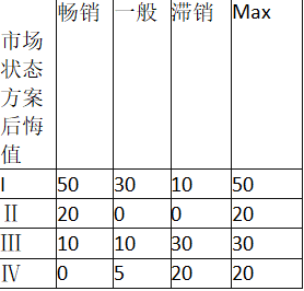解析 本题考查不确定型决策方法中的后悔值原则。 各方案的最大后悔值为{50,20,30,20},取其最小值min{50,20,30,20}=20,对应的方案是Ⅱ和Ⅳ,所以选D。