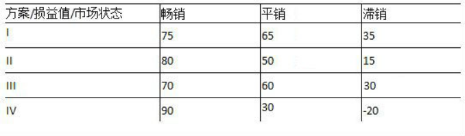 解析 此题考查不确定型决策方法中的乐观原则。乐观原则是指承担风险的决策者在方案取舍时以各方案在各种状态下的最大损益值为标准,在各方案的最大损益值中取最大者对应的方案。根据题干数据,各方案损益值的计算过程为: (1)在各方案的损益中找出最大者: 方案I:max{75,65,35}=75; 方案Ⅱ:max{80,60,15}=80; 方案Ⅲ:max{70,60,30}=70; 方案Ⅳ:max:{90,30,201}=90。 (2)在所有方案的最大损益值中找最大者:Max{75,80,70,90}=90。 因此,该企业应选择的方案为Ⅳ。