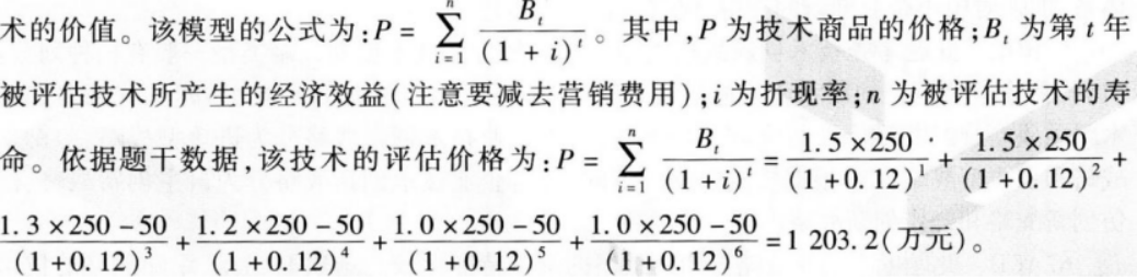 解析 此题考查效益模型的应用。技术价值评估的方法包括成本模型、市场模拟模型和效益模型三种。其中,效益模型的基本思路是,按技术所产生的经济效益来估算