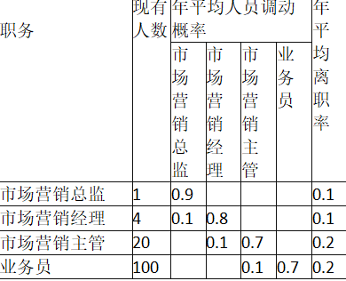 某企业根据人力资源需求与供给状况及相关资料,制定2017年人力资源总体规划和人员接续及升迁计划,经过调查研究,确认该企业的市场营销人员变动矩阵如下表所示:...