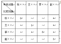 某企业财务部门运用一一对比法对所属的4名员工进行绩效考核,考核情况如下表所示(“+"表示考核对象比比较对象绩效水平高,‘‘O’’表示两者绩效水平相同, ...