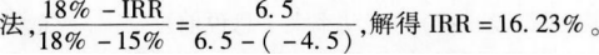 问题 某投资方案贴现率为15%时,净现值为-4.5,贴现率为18%时,净现值为6.5,则该方案的内部报酬率为( )。