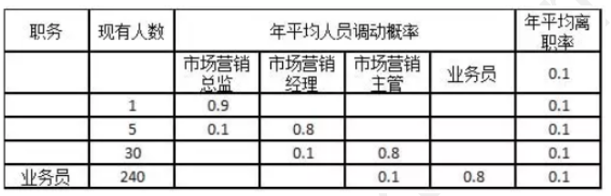 某企业根据人力资源需求与供给状况及相关资料,制定2019年人力资源总体规划和人员接续及升迁计划。经过调查研究,确认该企业的市场营销人员变动矩阵如下表所示:...