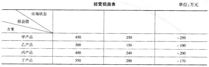 问题 共用题干 国内某手机生产企业将目标顾客定位于年轻购买者群体,专门生产具有较强娱乐功能的智能手机产品,取得了良好的市场效果。该企业以控股的形式,获取另一手机生产商60%的股权,企业实力明显加强。为增加经营收入,该企业以贴牌生产的形式与某国际知名手机生产商建立战略联盟,生产新型智能手机产品。新型手机产品方案共有甲产品、乙产品、丙产品和丁产品四种可供选择。每种产品方案均存在着畅销、一般、滞销三种市场状态。每种方案的市场状态及损益值见下表: