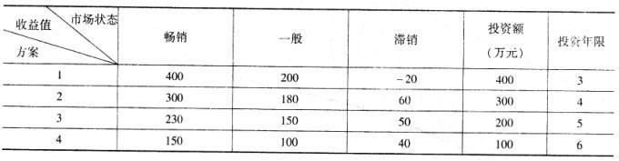 问题 共用题干 某公司十年来一直只生产电视机显像管,产品质量较高,经营状况良好。2006年该公司与某电视机生产企业联合,开始生产电视机成品,拟生产三种不同型号的电视机产品,有四种备选方案,每种方案的投资额、经营期限、市场状态和收益值如下表所示,畅销、一般、滞销的概率分别为0.3、0.5、0.2。