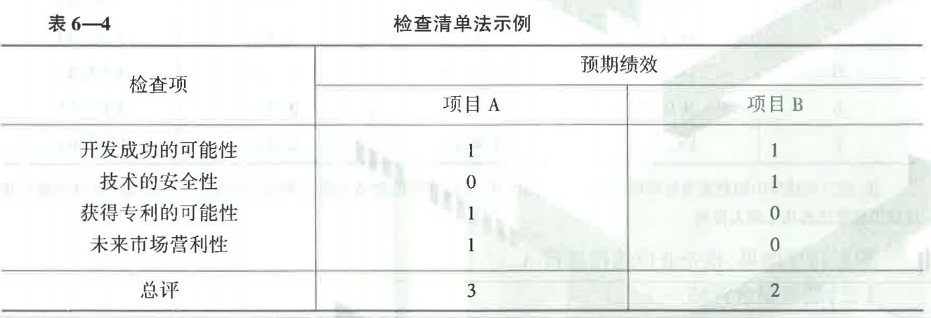 解析 题干所述为检查清单法。检查清单法与轮廓图法类似,都需要首先确定一组评价研发项目的关键因素。与轮廓图法不同的是,这种方法对每一方案的各个评判标准给出是否满意的定性判断, 一个简单的例子见表 6-4 (其中满意为 1 ,不满意为 0) ,应优先选择得分高的项目 A。 在实际应用中,用以评价项目的检查清单可以包括从公司战略目标到市场因素、生产因素等方面的内容。