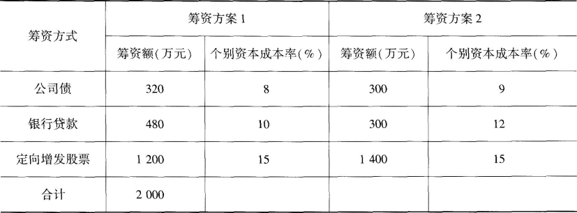问题 某食品企业为了扩大生产规模,提高市场占有率,经过市场考察决定收购某同类企业。为了完成并购,需要融资2000万元,现在有两种备选筹资方案,具体情况见下表。 筹资方案1的加权平均资本成本率为( )。