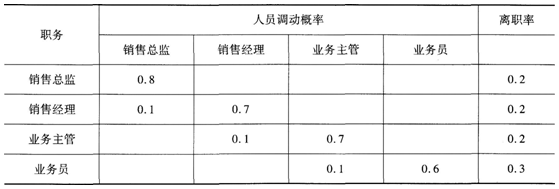 某企业人力资源部采用下列方法对下一年的人力资源供给情况进行预测.供给情况见下表。期初人员数量分别为销售总监20人、销售经理40人、业务主管60人、业务员8...
