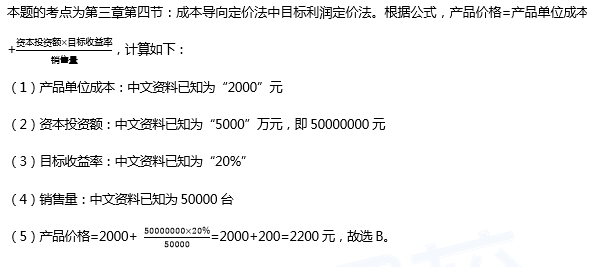 问题 某企业的产品组合为2种液晶电视机、3种空调机、5种洗衣机和4种电冰箱。为了扩大液晶电视机的销量,该企业与经销商签订协议,约定“10天内付款的客户可享受2%的价格优惠,30天内付款的客户全价付款”,同时,该企业拟开发一种新型电冰箱,经测算,投资额为5000万,单位成本为2000元,预期销售量为50000台,投资收益率为20%。该种电冰箱推出后,该企业拟建立营销渠道;只选择一家销售商代理该种电冰箱的销售,再由该销售商销售给消费者。 根据目标利润定价法,该企业的新型电冰箱的目标价格为()元。