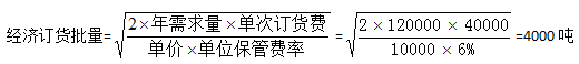 问题 某塑料制品企业一种原材料的年需求量为120000吨,单价为1万元/吨,单次订货费用为4万元,每吨年保管费率为6%,则该种原材料的经济订货批量为( )吨。