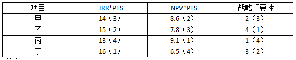 某企业采用动态排序列表法,对四个备选项目进行评估,评估结果见下表: 注:IRR为预期内部收益率,PTS为技术成功的概率,NPV为预期收益净现值,括号...