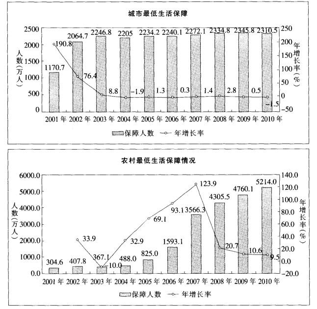 下列说法中不正确的是()。A.2001-2010年,城市居民最低生活保障人数增长率下降的有6年B.城市和农村居民最低生活保障人数都是逐年递增的...