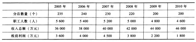 万利家具公司为中档卧室家具生产企业,成立于1995年,并于2000年在深圳证券交易所公开发行股票及上市。万利家具公司2005年至2010年间分店数量、职工人数、收入总额及税前利润数据如下: