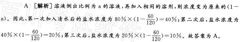 从装有120克浓度为80%的盐水的烧杯中倒出60克盐水后,再加入60克清水并使之混合均匀。接着重复以上步骤2次,问最终烧杯中的盐水的浓度为多少?() ...