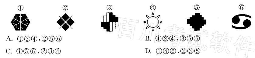 问题 把下面的六个图形分为两类,使每一类都有各自的共同特征或规律,分类正确的一项是: