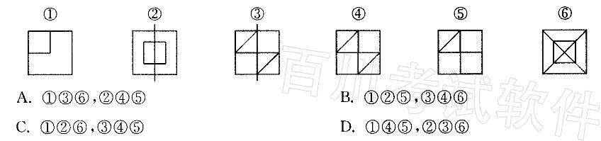 把下面的六个图形分为两类,使每一类图形都有各自的共同特征或规律,分类正确的一项是:
