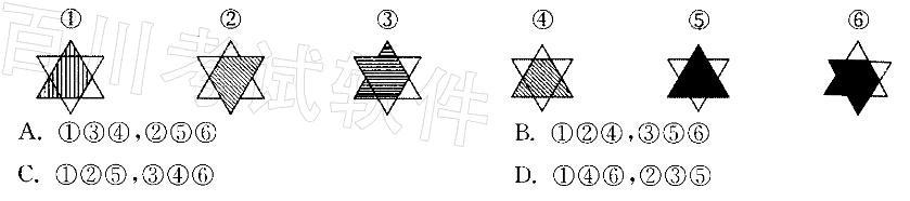 解析 ①②④六角星内部的阴影部分面积相等;③⑤⑥六角星内部的填充部分面积相等;故本题选B。