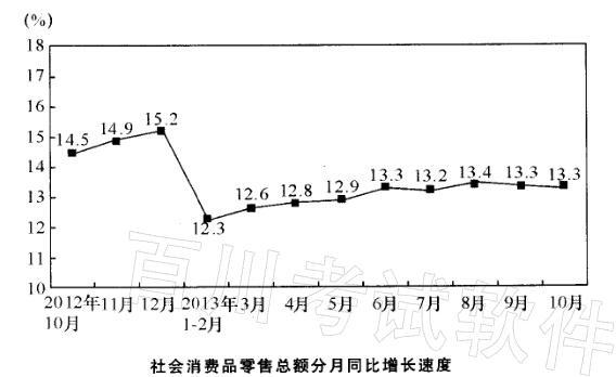解析 2013年10月份,城镇消费品零售额同比增长13.1%小于社会消费品零售总额同比增长13.3%,故前者占后者的比重相对于上年同期来说是下降的,故A项错误。同理可得,B项正确,C、D项错误。故答案为B。