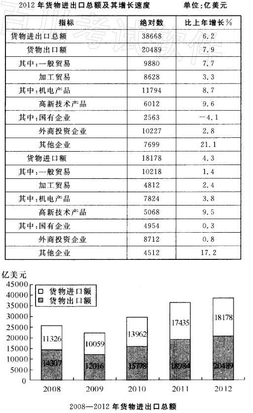 解析 2012年,一般贸易货物进出口差额为(9880—10218)亿美元;加工贸易货物进出口差额为8628-4821=3807(亿美元);国有企业货物进出口差额为(2563—4954)亿美元;外商投资企业货物进出口差额为10227-8712=1515(亿美元)。显然加工贸易货物进出口差额最大,答案为B。