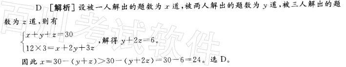 问题 三个中学生比赛做国际物理奥林匹克试题。每人都解出了 30道题中的12道,且所有题都已被这三人解出。这30道物理题中,被其中一人、两人和三人解出的题数各不相等,则被其中一人解出的题数是()。 A.14 B.15 C.22 D.25