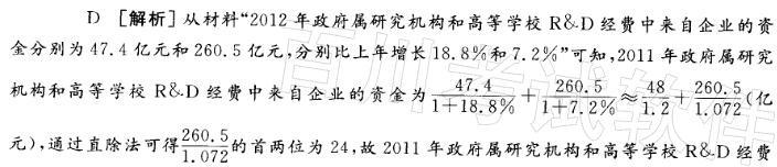 问题 数据显示,2012年各类企业R D经费投入7842.2亿元,比上年增长19.2%,占全社会R D经费的比重达76.2%。2012年规模以上高技术工业企业R D经费投入为1733.8亿元,比上年增长20.3%。与此同时,2012年政府属研究机构和高等学校R D经费中来自企业的资金分别为47.4亿元和260.5亿元,分别比上年增长18.8%和7.2%。这在一定程度上表明产学研合作方式有所加强。 从产业部门看,工业企业R D经费投入额达到7200.6亿元人民币,而制造业,特别是中高端制造业成为了R D投入的重点。 2011年政府属研究机构和高等学校R D经费中来自企业的资金为()。 A.253亿元 B.263亿元 C. 273亿元 D.283亿元