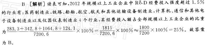 问题 数据显示,2012年各类企业R D经费投入7842.2亿元,比上年增长19.2%,占全社会R D经费的比重达76.2%。2012年规模以上高技术工业企业R D经费投入为1733.8亿元,比上年增长20.3%。与此同时,2012年政府属研究机构和高等学校R D经费中来自企业的资金分别为47.4亿元和260.5亿元,分别比上年增长18.8%和7.2%。这在一定程度上表明产学研合作方式有所加强。 从产业部门看,工业企业R D经费投入额达到7200.6亿元人民币,而制造业,特别是中高端制造业成为了R D投入的重点。 2012年,规模以上工业企业中R D经费投入强度超过1.5%的行业的经费投入额占全部规模以上工业企业的比重达()。 A.24.3% B.25.2% C. 26.1% D.27.0%