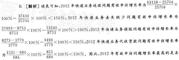 问题 2012年,下列各项快递业务有效申诉问题中,增长率最高的是( )。 A.延误 B.丢失短少 C.损毁 D.代收货款