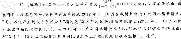 问题 2013年1—10月份,主要石化产品产量稳步增长。原油加工量39687万吨、成品油产量24530万吨、乙烯产量1325万吨,同比增长4.1%、5.2%、7.3%;合成树脂产量4793万吨、合成橡胶产量339万吨,同比增长10.6%、6.5%;化肥产量6717万吨(折纯,下同),同比增长7. 1%。 2013年1—10月份,石化产业完成投资14383亿元,同比增长18.3高于前三季度约1个百分点,增速同比回落13.3个百分点,与同期工业固定资产投资增速持平。其中,炼油行业完成投资1761亿元,同比增长25.9%,较前三季度增长约3.8个百分点,增速同比上升2.6个百分点;化工行业完成投资11736亿元,同比增长16.1%,较前三季度增长约0.5个百分点,增速同比回落15.1个百分点。代表行业高端制造水平的合成材料制造业完成投资1538亿元,同比增长22.1%,高出石化产业约3.8个百分点。 2013年1—10月份,石化产业进出口贸易总额约3346亿美元,同比增长2.3%。进口额约1885亿美元,同比增长约0.6%;出口额1462亿美元,同比增长4.5%;全行业贸易逆差约423亿美元。大宗进口产品中,有机化学品和合成树脂进口额分别为451亿和414亿美元,同比增长15.1%和2.9%。无机化学品、合成橡胶进口额分别为74.8亿和36.9亿美元,同比下降0.5%和15.3%。合成纤维单体进口额118亿美元,同比下降19.3%,其中对苯二甲酸(PTA)、己内酰胺等重要单体降幅在40%以上。单月看,10月份进出口贸易总额320亿美元,同比增长2.1%。进口额174亿美元,同比下降3.3%;出口额146亿美元,同比增长9.5%。 够从上述资料中推出的是( )。 A. 2012年1—10月乙烯产量约为1185万吨 B. 2012年1—10月合成材料制造业完成投资额同比增长35.4% C. 2013年10月石化产业出口额占1—10月的比重比去年有所增加 D. 2013年1—10月成品油日均产量同比增速历经三起三落