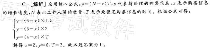 问题 为应对春运期间的汽车站售票高峰,客运部门开展了网上提前售票业务。某天工作人员上班时发现昨天下班到今天上班前已累积了一定数量的购票信息,假定从上班开始单位时间出现的新的购票信息数量相同,如果6名工作人员同时处理需1.5小时,如果5名工作人员同时处理需2小时,如果4名工作人员同时处理需()小时。 A.4 B.3.5 C.3 D.2.5